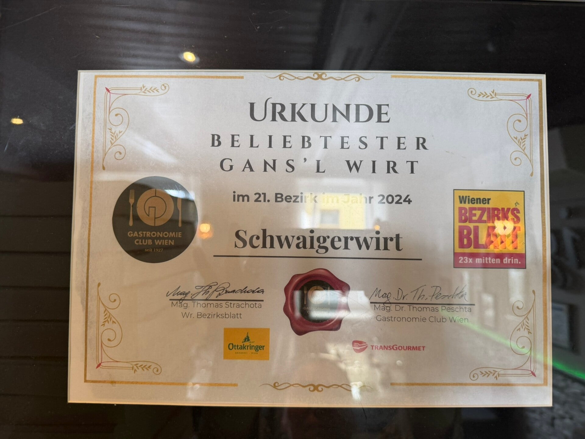 Schon im ersten Jahr folgt die erste große Auszeichnung: Der Schwaigerwirt wird zum Lieblingswirt Wiens gewählt.