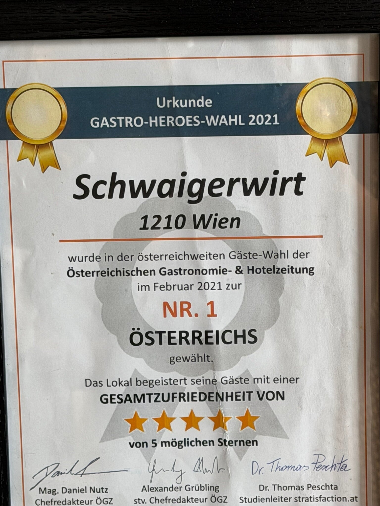 Aktuelle Auszeichnung zum beliebtesten Wirten in ganz Wien und in Floridsdorf sowieso:))